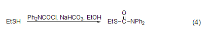 與巰基的反應(yīng)  在堿性條件下 (如NaHCO3),在溶液中DPC-Cl可與硫醇反應(yīng) (式4)[8]