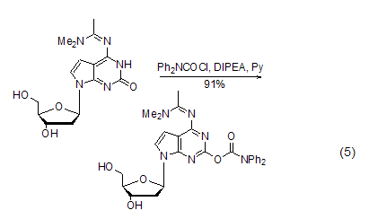 用作寡聚核苷酸合成時(shí)的保護(hù)基  在合成寡聚核苷酸時(shí),鳥嘌呤核苷的堿基容易發(fā)生副反應(yīng),需要加以保護(hù),DPC-Cl可以將鳥嘌呤堿基的烯醇異構(gòu)體酰基化而對(duì)其進(jìn)行保護(hù),這種方法在合成具有鳥嘌呤堿基和與鳥嘌呤堿基類似的核苷化合物時(shí)[9~12],發(fā)揮著重要作用 (式5)。